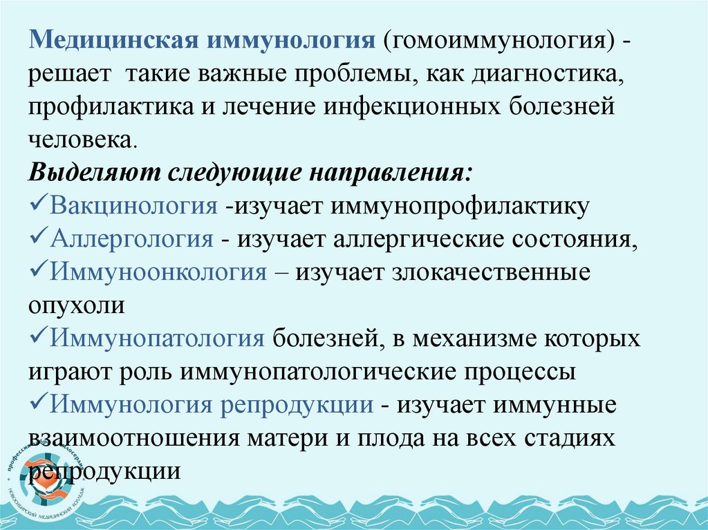Медицинская иммунология (гомоиммунология) решает такие важные проблемы, как диагностика,профилактика и лечение инфекционных болезней