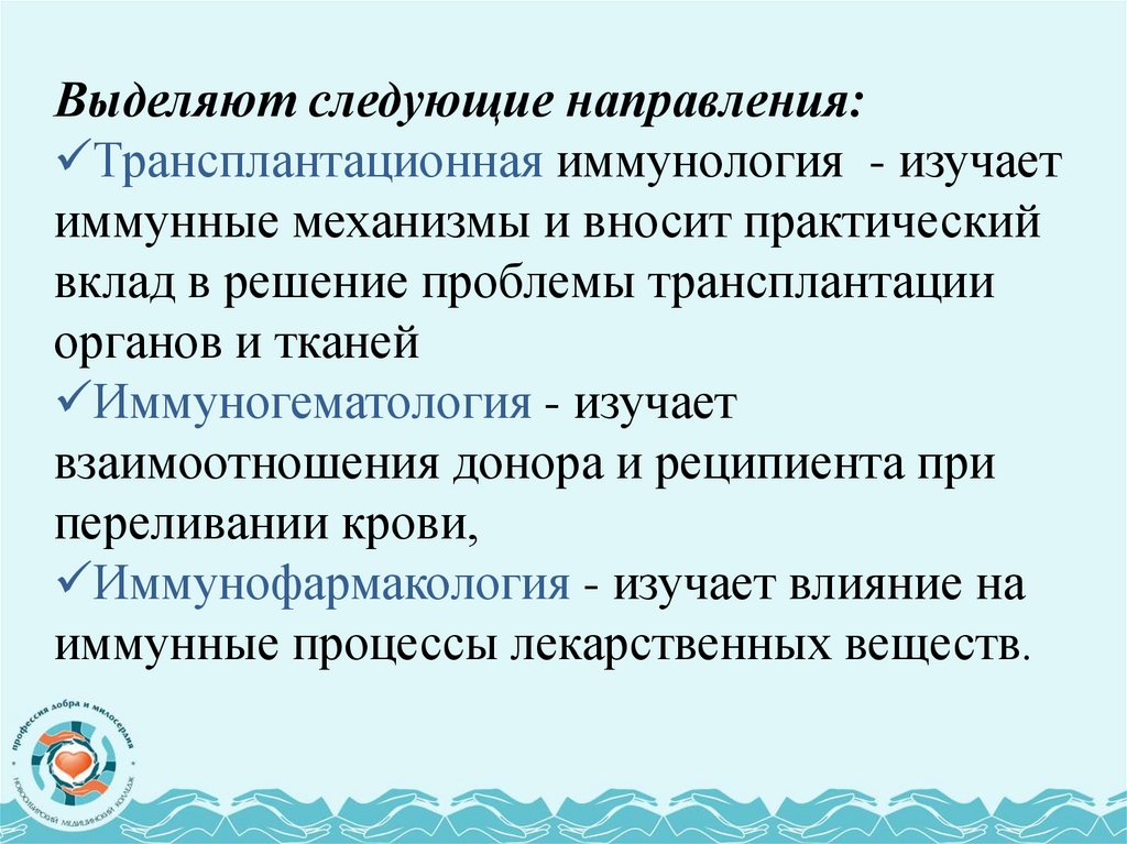 Выделяют следующие направления:Трансплантационная иммунология - изучает