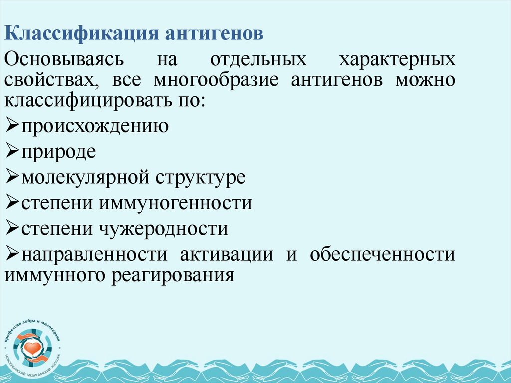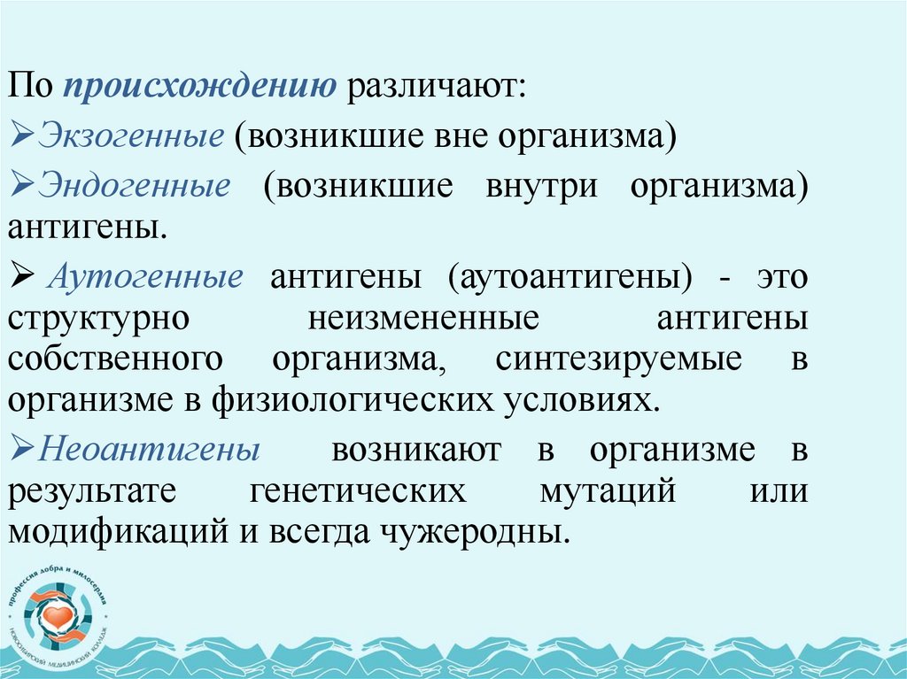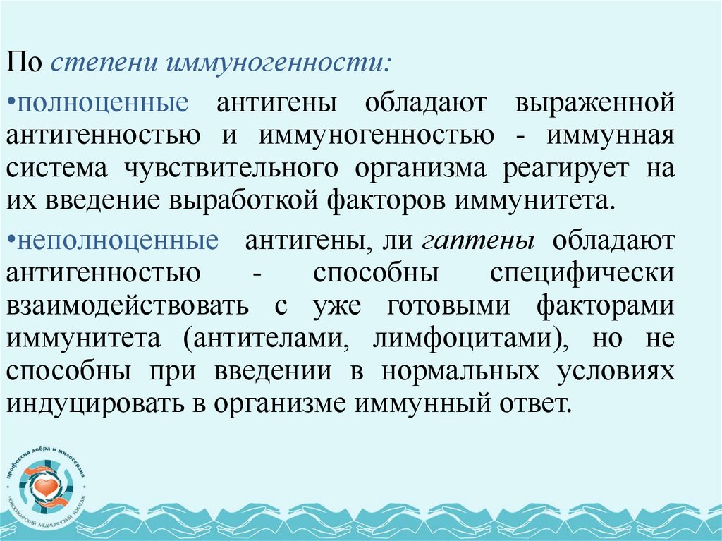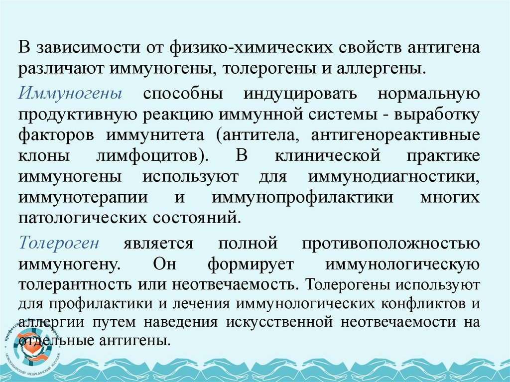 В зависимости от физико-химических свойств антигенаразличают иммуногены, толерогены и аллергены.