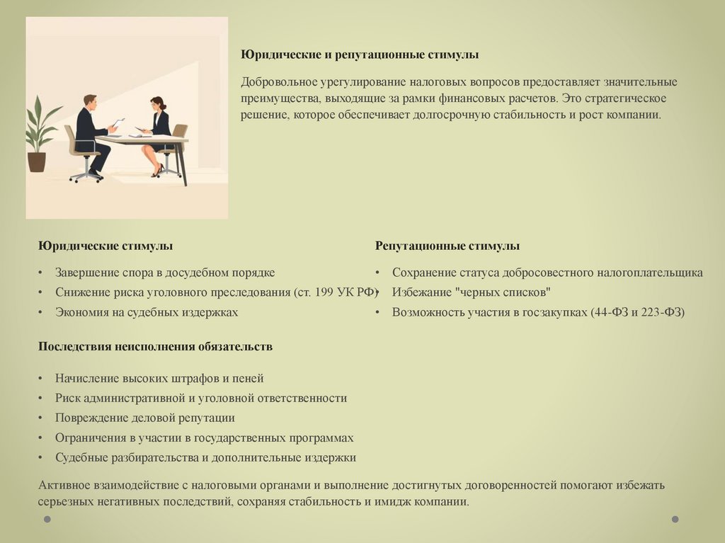 Юридические и репутационные стимулыДобровольное урегулирование налоговых вопросов предоставляет значительные