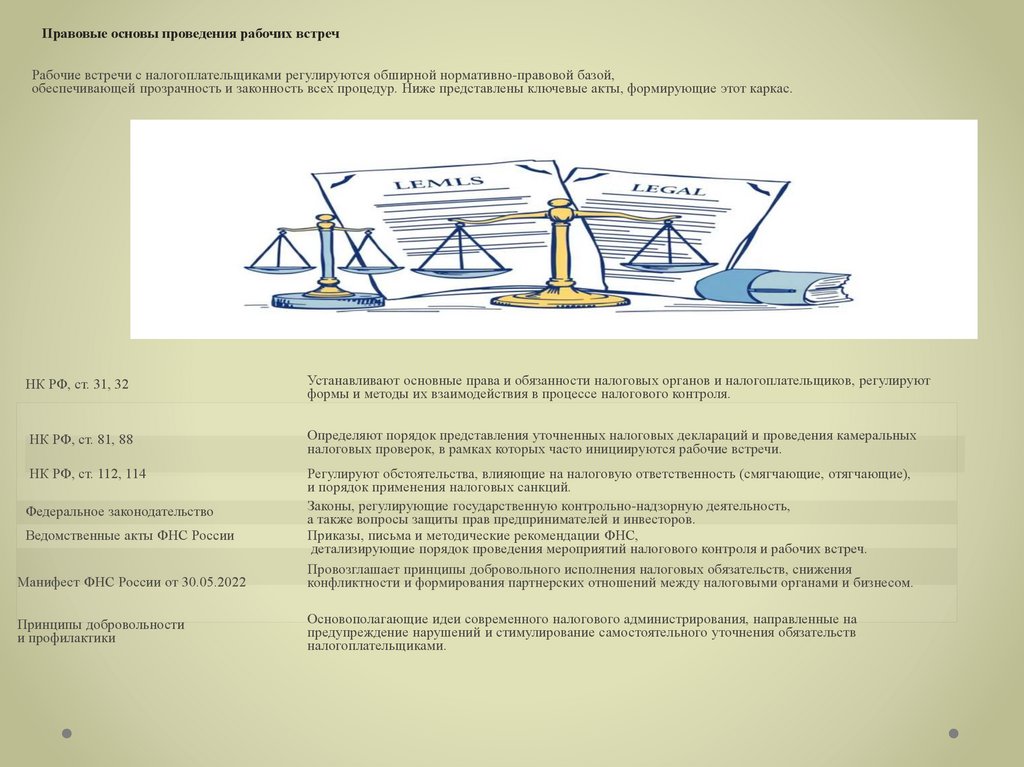 Правовые основы проведения рабочих встречРабочие встречи с налогоплательщиками регулируются обширной нормативно-правовой базой,