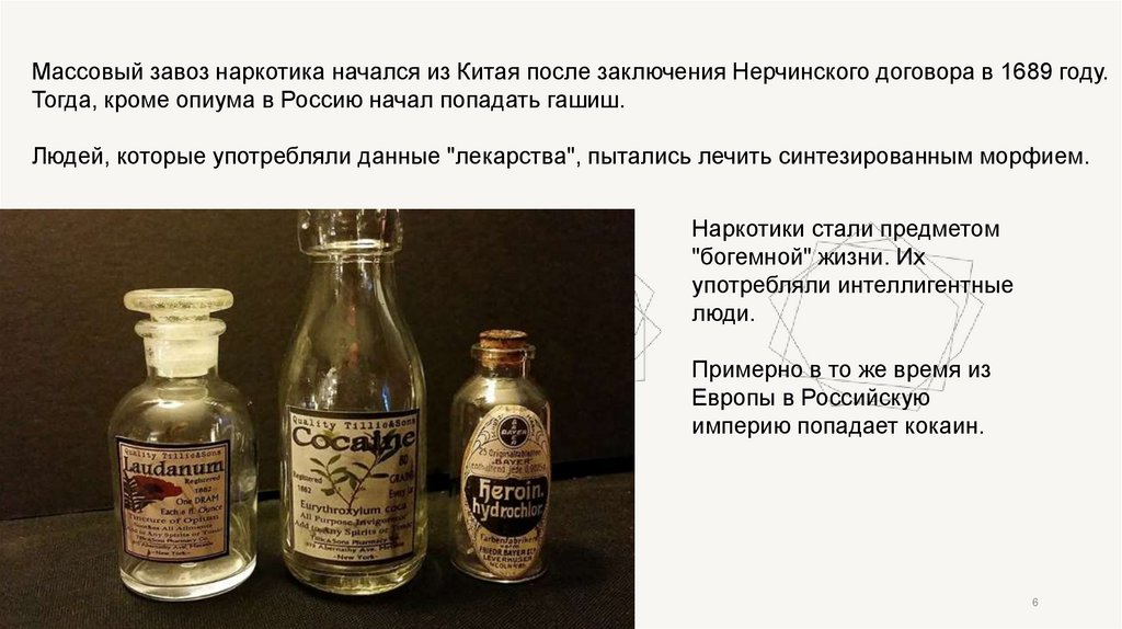 Массовый завоз наркотика начался из Китая после заключения Нерчинского договора в 1689 году.Тогда, кроме опиума в Россию начал попадать гашиш.