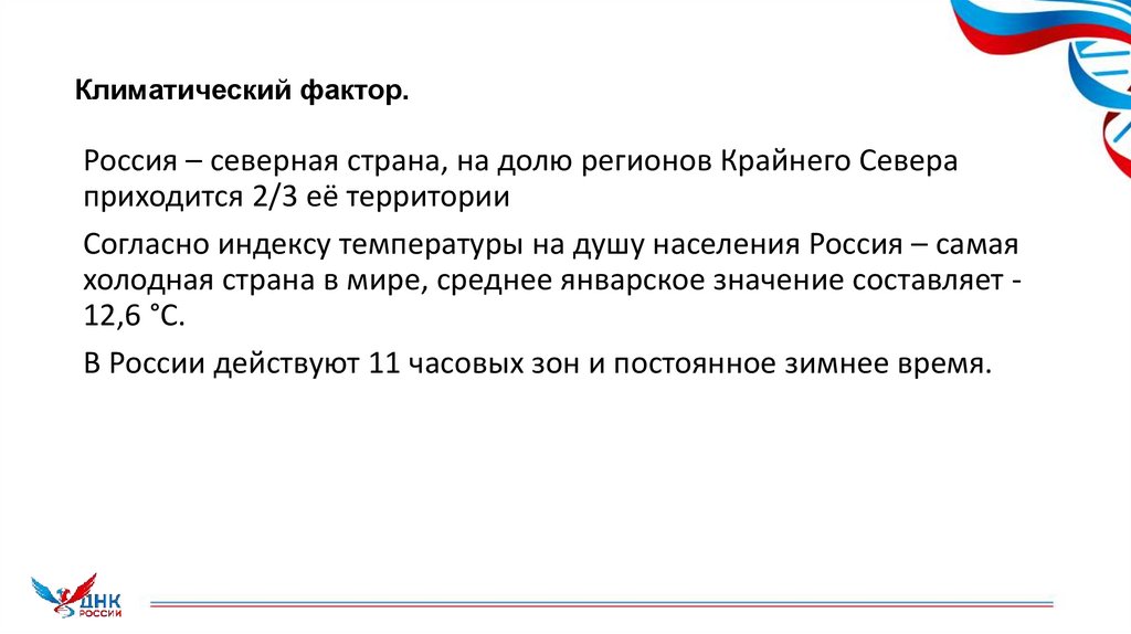Климатический фактор.Россия – северная страна, на долю регионов Крайнего Севера