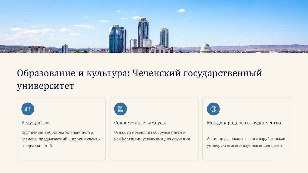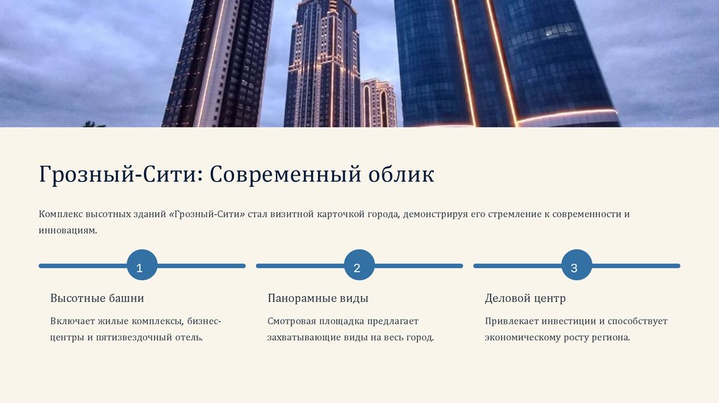 Грозный-Сити: Современный обликКомплекс высотных зданий «Грозный-Сити» стал визитной карточкой города, демонстрируя его стремление к современности и