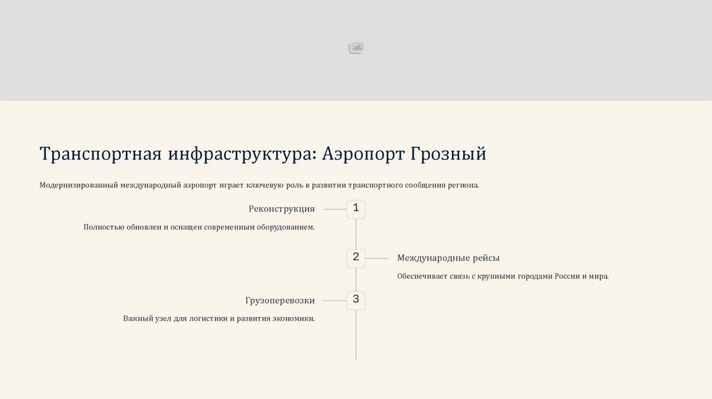 Транспортная инфраструктура: Аэропорт ГрозныйМодернизированный международный аэропорт играет ключевую роль в развитии транспортного сообщения региона.
