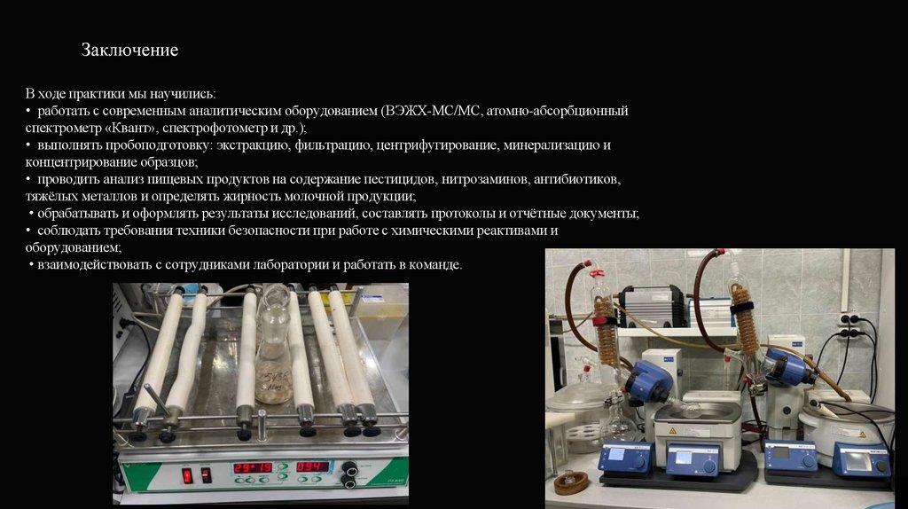 • работать с современным аналитическим оборудованием (ВЭЖХ-МС/МС, атомно-абсорбционный