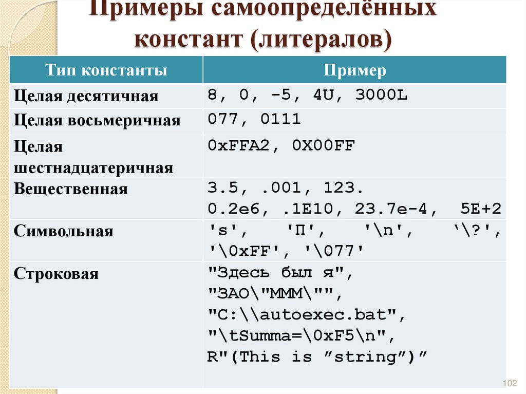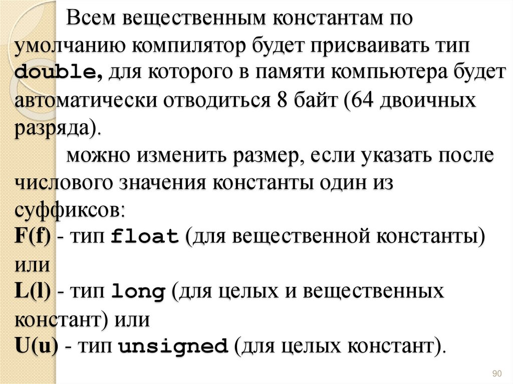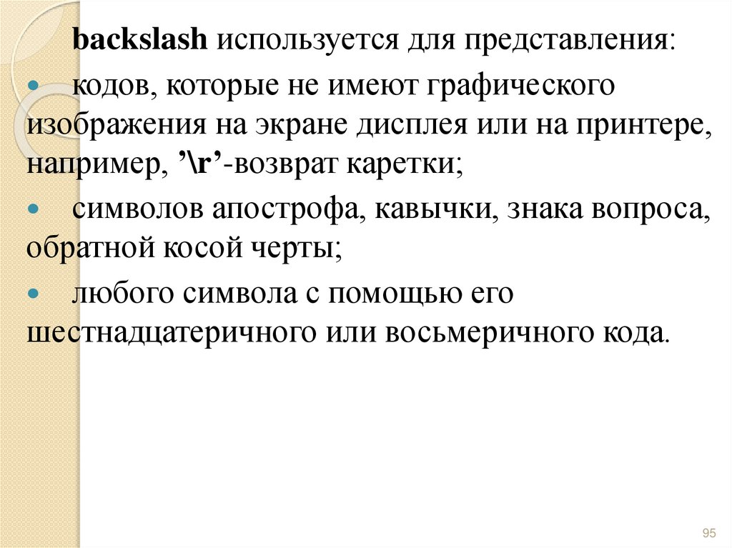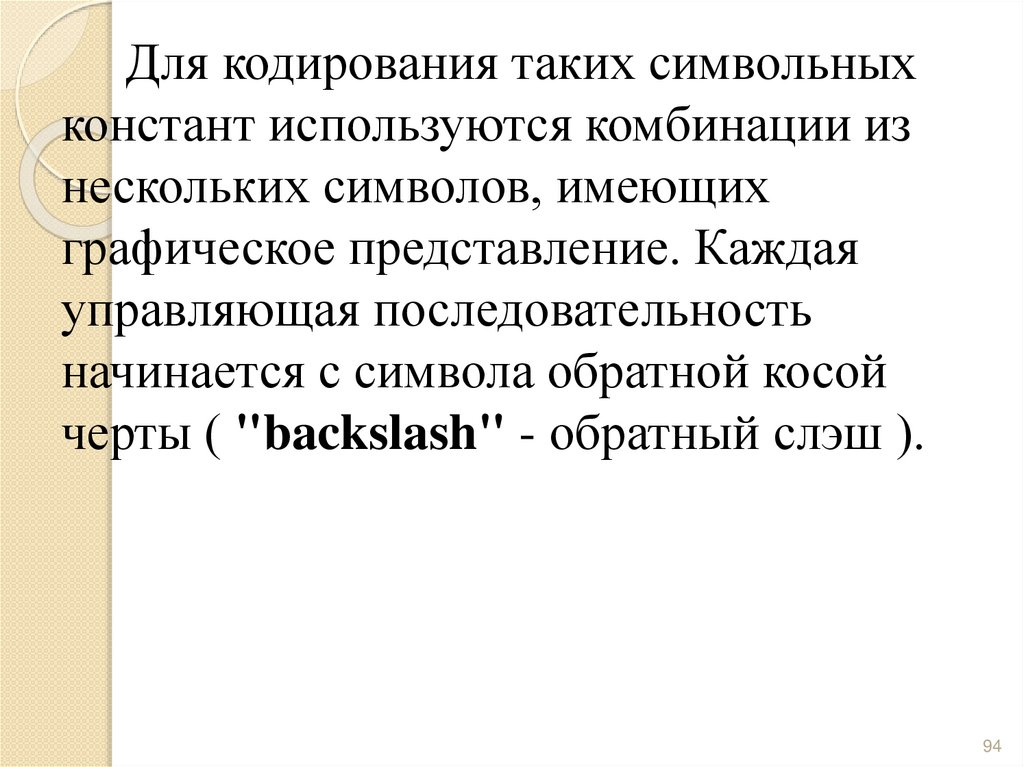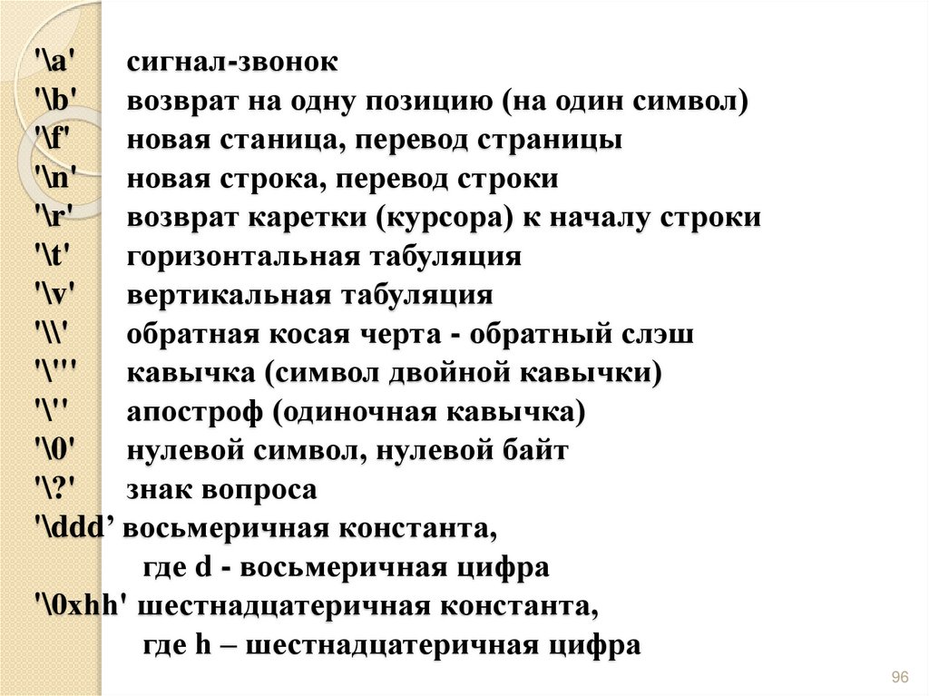96. '\a' сигнал-звонок '\b' возврат на одну позицию (на один символ) '\f' новая станица, перевод страницы '\n' новая строка,