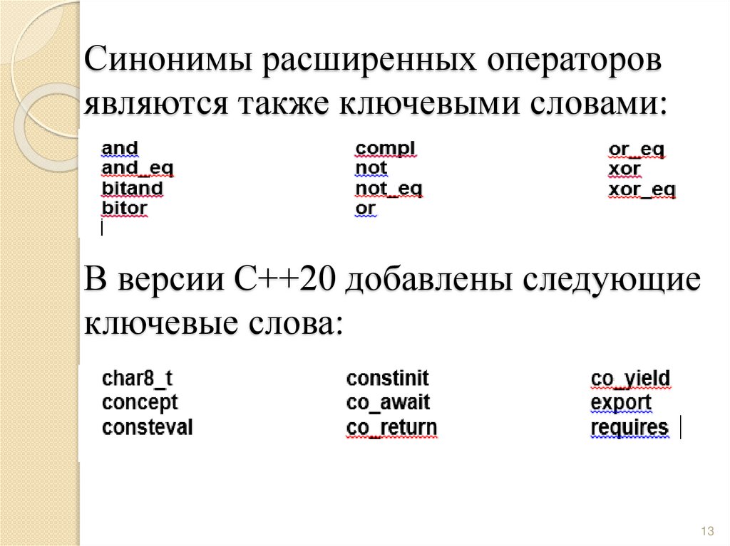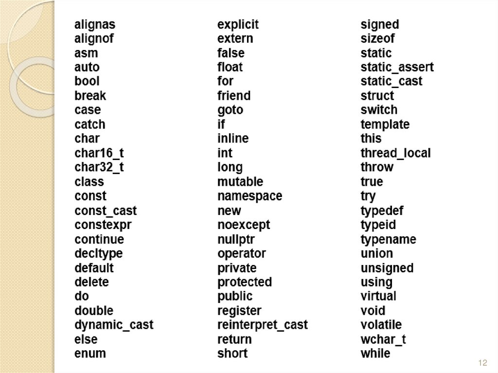 11. Ключевые слова это такие слова, которые имеют предопределенное значение в языке и их нельзя использовать для других целей.