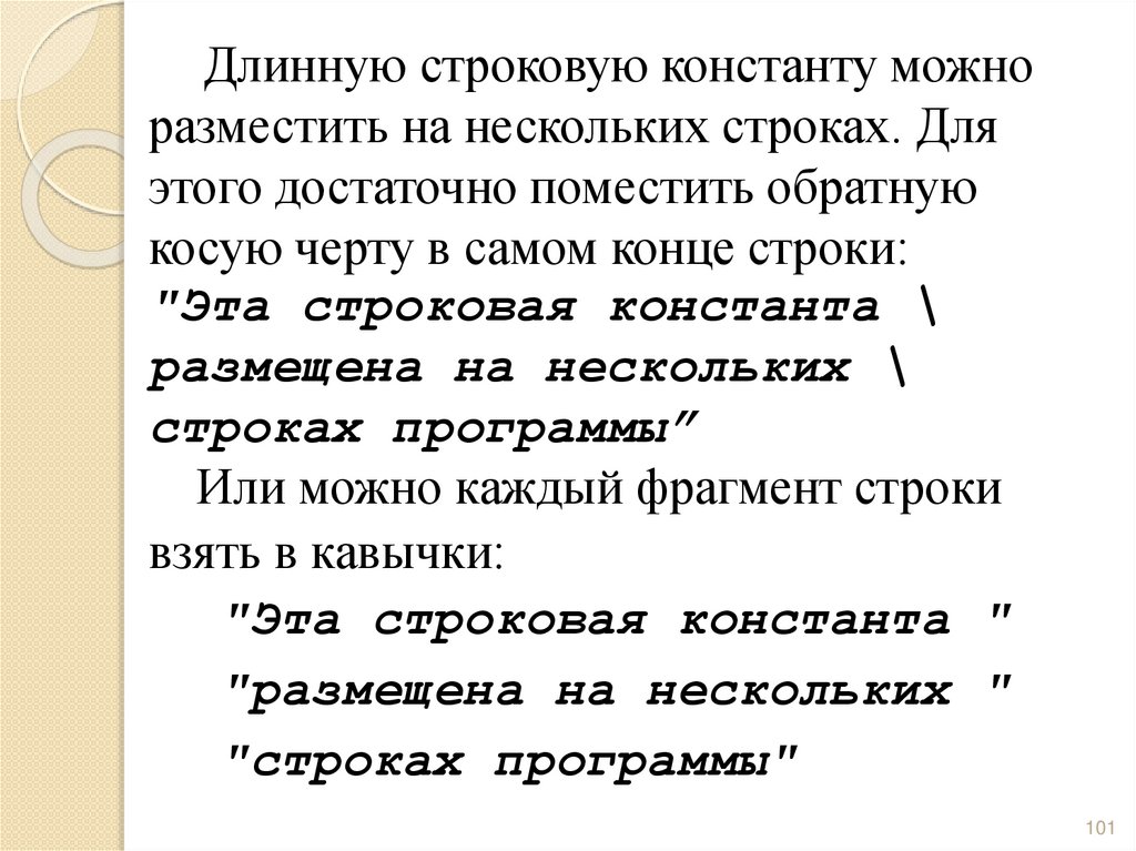 Длинную строковую константу можноразместить на нескольких строках. Для