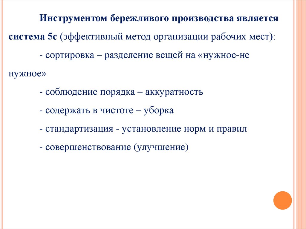 Инструментом бережливого производства являетсясистема 5с (эффективный метод организации рабочих мест):