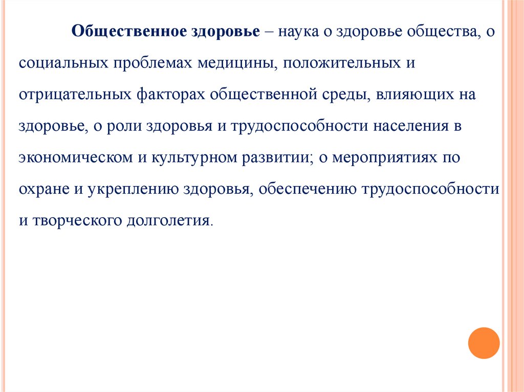 Общественное здоровье – наука о здоровье общества, осоциальных проблемах медицины, положительных и