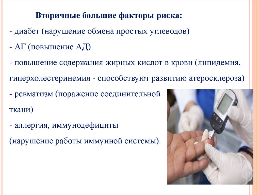 Вторичные большие факторы риска:- диабет (нарушение обмена простых углеводов)