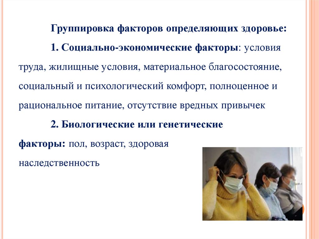 Группировка факторов определяющих здоровье:1. Социально-экономические факторы: условия