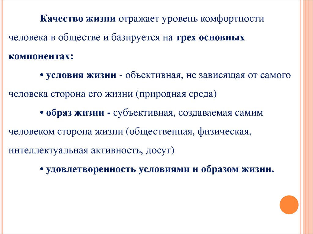 Качество жизни отражает уровень комфортностичеловека в обществе и базируется на трех основных
