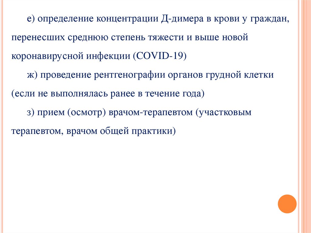 е) определение концентрации Д-димера в крови у граждан,перенесших среднюю степень тяжести и выше новой