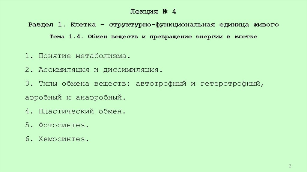 Тема 1.4. Обмен веществ и превращение энергии в клетке