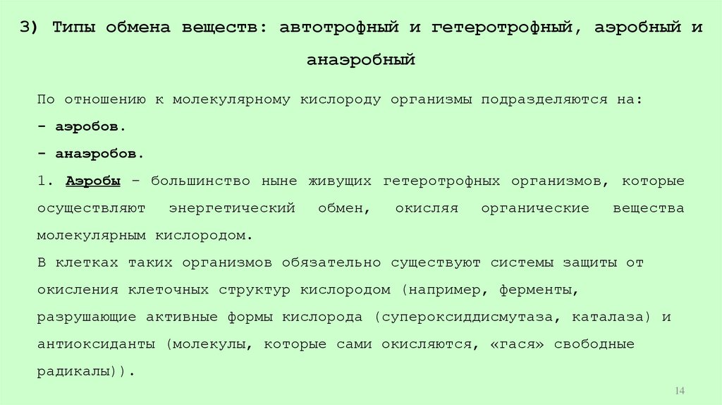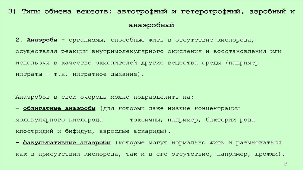 3) Типы обмена веществ: автотрофный и гетеротрофный, аэробный ианаэробный