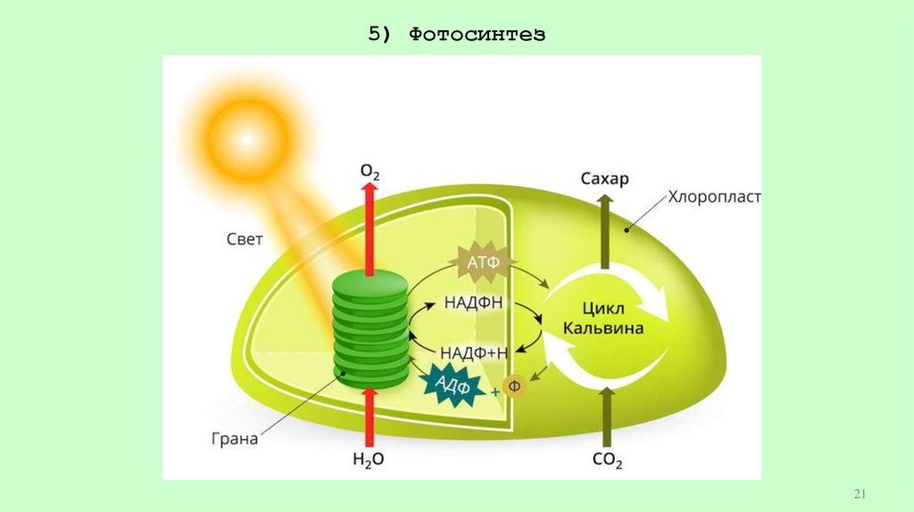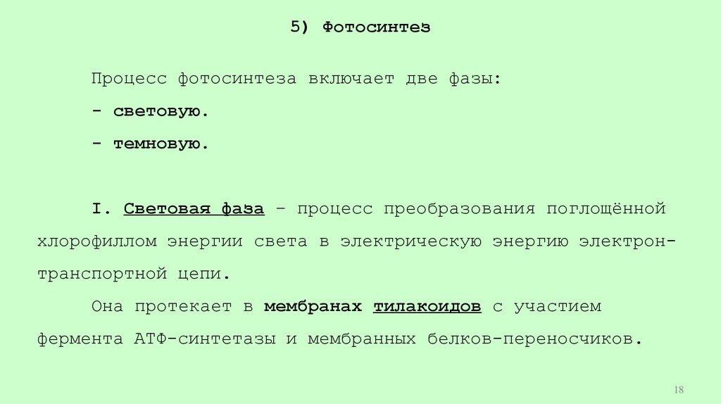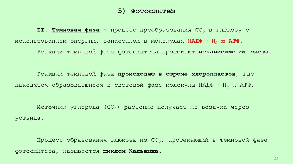 5) ФотосинтезII. Темновая фаза – процесс преобразования CO2 в глюкозу с
