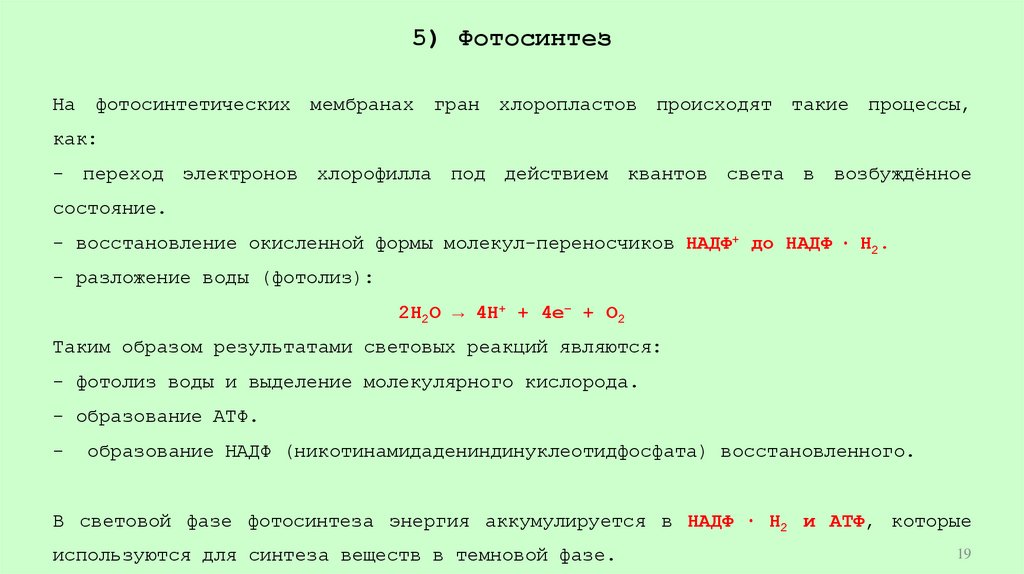 - восстановление окисленной формы молекул-переносчиков НАДФ+ до НАДФ ⋅ H2.