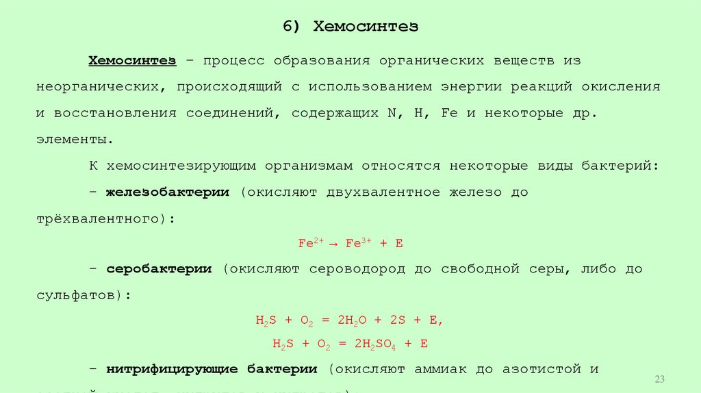 6) ХемосинтезХемосинтез – процесс образования органических веществ из