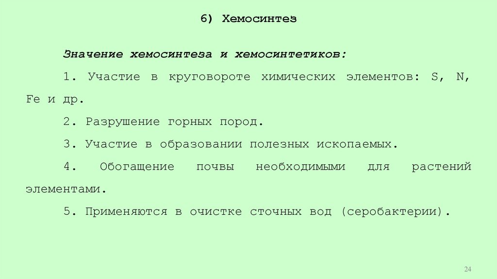 6) ХемосинтезЗначение хемосинтеза и хемосинтетиков: