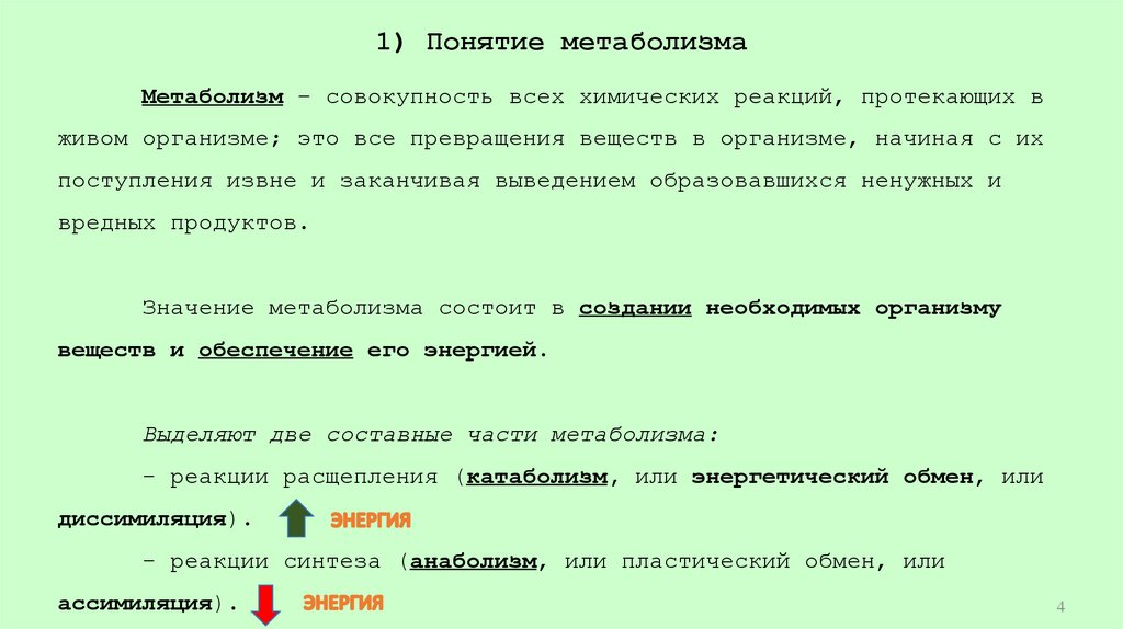 1) Понятие метаболизмаМетаболизм – совокупность всех химических реакций, протекающих в