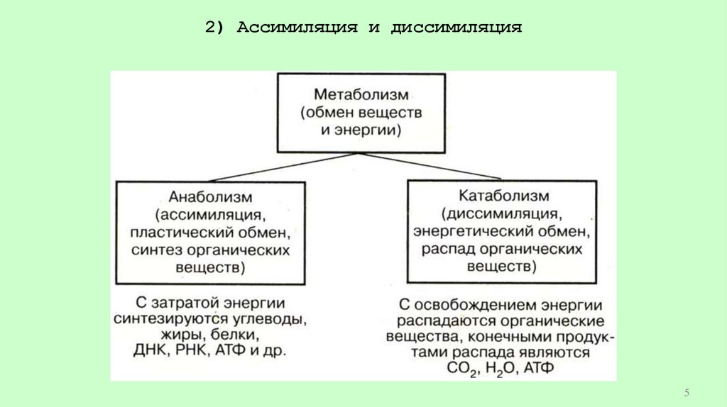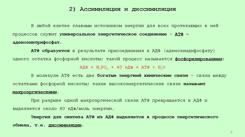 2) Ассимиляция и диссимиляцияВ любой клетке главным источником энергии для всех протекающих в ней