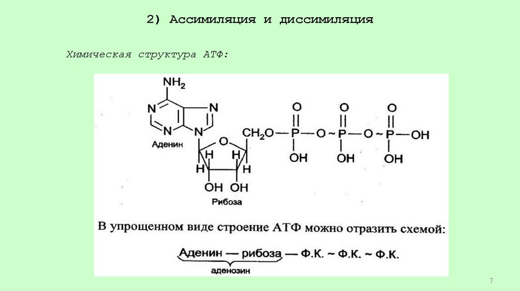 2) Ассимиляция и диссимиляцияХимическая структура АТФ: