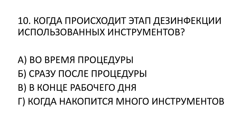 10. КОГДА ПРОИСХОДИТ ЭТАП ДЕЗИНФЕКЦИИИСПОЛЬЗОВАННЫХ ИНСТРУМЕНТОВ?