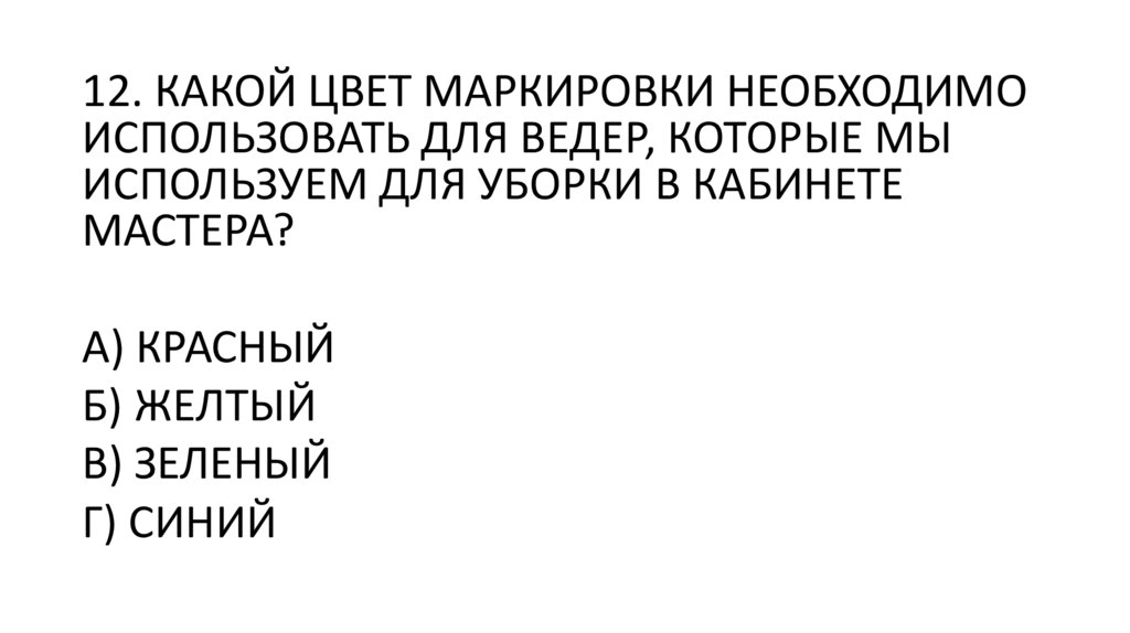 12. КАКОЙ ЦВЕТ МАРКИРОВКИ НЕОБХОДИМОИСПОЛЬЗОВАТЬ ДЛЯ ВЕДЕР, КОТОРЫЕ МЫ