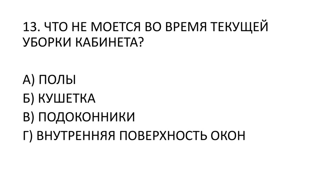 13. ЧТО НЕ МОЕТСЯ ВО ВРЕМЯ ТЕКУЩЕЙУБОРКИ КАБИНЕТА?