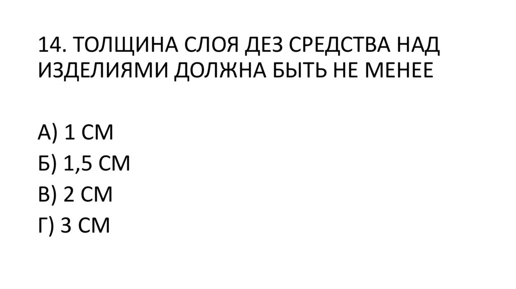 14. ТОЛЩИНА СЛОЯ ДЕЗ СРЕДСТВА НАДИЗДЕЛИЯМИ ДОЛЖНА БЫТЬ НЕ МЕНЕЕ