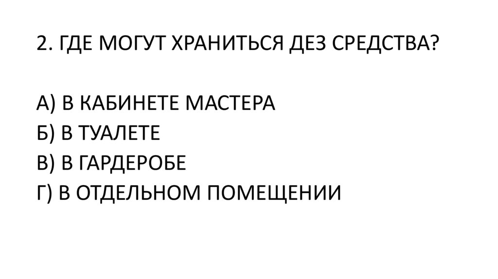 2. ГДЕ МОГУТ ХРАНИТЬСЯ ДЕЗ СРЕДСТВА?А) В КАБИНЕТЕ МАСТЕРА
