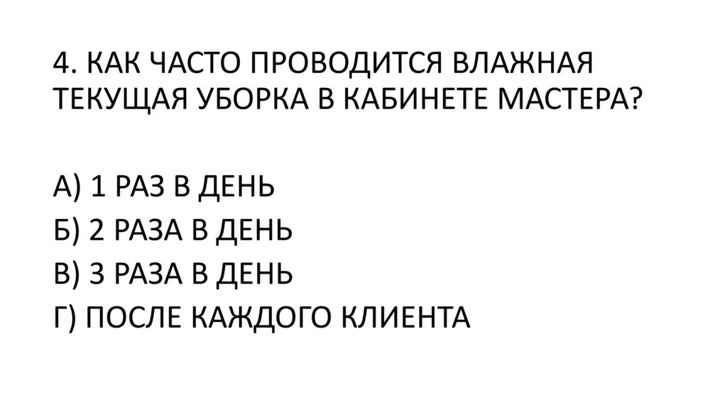 4. КАК ЧАСТО ПРОВОДИТСЯ ВЛАЖНАЯТЕКУЩАЯ УБОРКА В КАБИНЕТЕ МАСТЕРА?