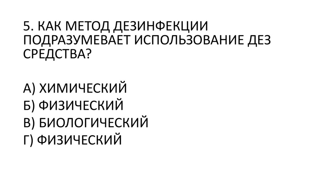 5. КАК МЕТОД ДЕЗИНФЕКЦИИПОДРАЗУМЕВАЕТ ИСПОЛЬЗОВАНИЕ ДЕЗ