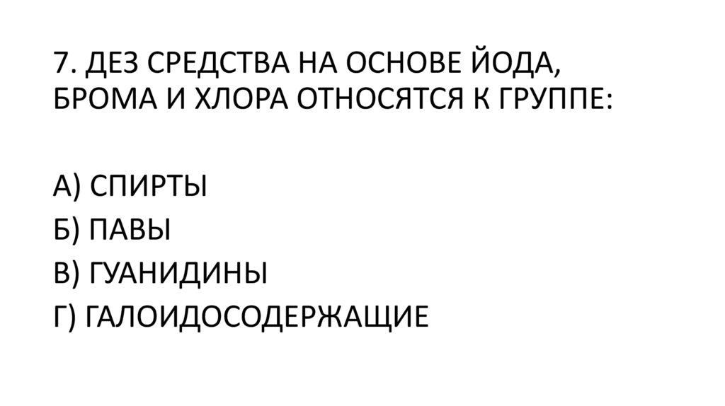 7. ДЕЗ СРЕДСТВА НА ОСНОВЕ ЙОДА,БРОМА И ХЛОРА ОТНОСЯТСЯ К ГРУППЕ: