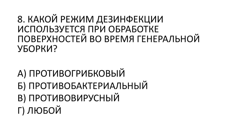 8. КАКОЙ РЕЖИМ ДЕЗИНФЕКЦИИИСПОЛЬЗУЕТСЯ ПРИ ОБРАБОТКЕ