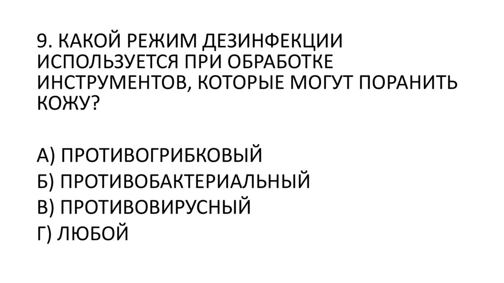 9. КАКОЙ РЕЖИМ ДЕЗИНФЕКЦИИИСПОЛЬЗУЕТСЯ ПРИ ОБРАБОТКЕ