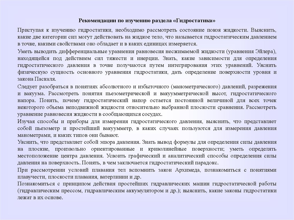 Рекомендации по изучению раздела «Гидростатика»Приступая к изучению гидростатики, необходимо рассмотреть состояние покоя жидкости. Выяснить,