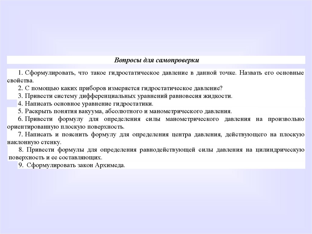 Вопросы для самопроверки1. Сформулировать, что такое гидростатическое давление в данной точке. Назвать его основные
