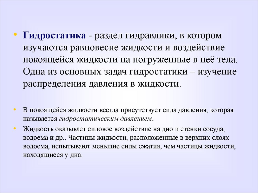 Одна из основных задач гидростатики – изучение