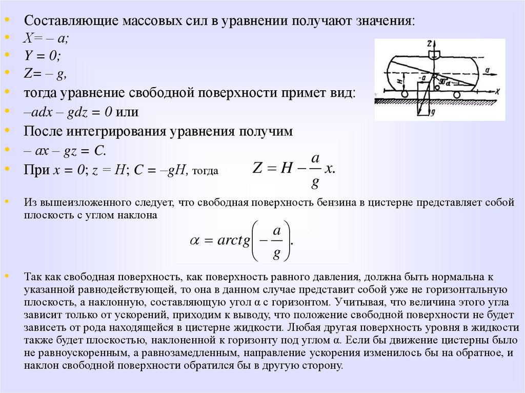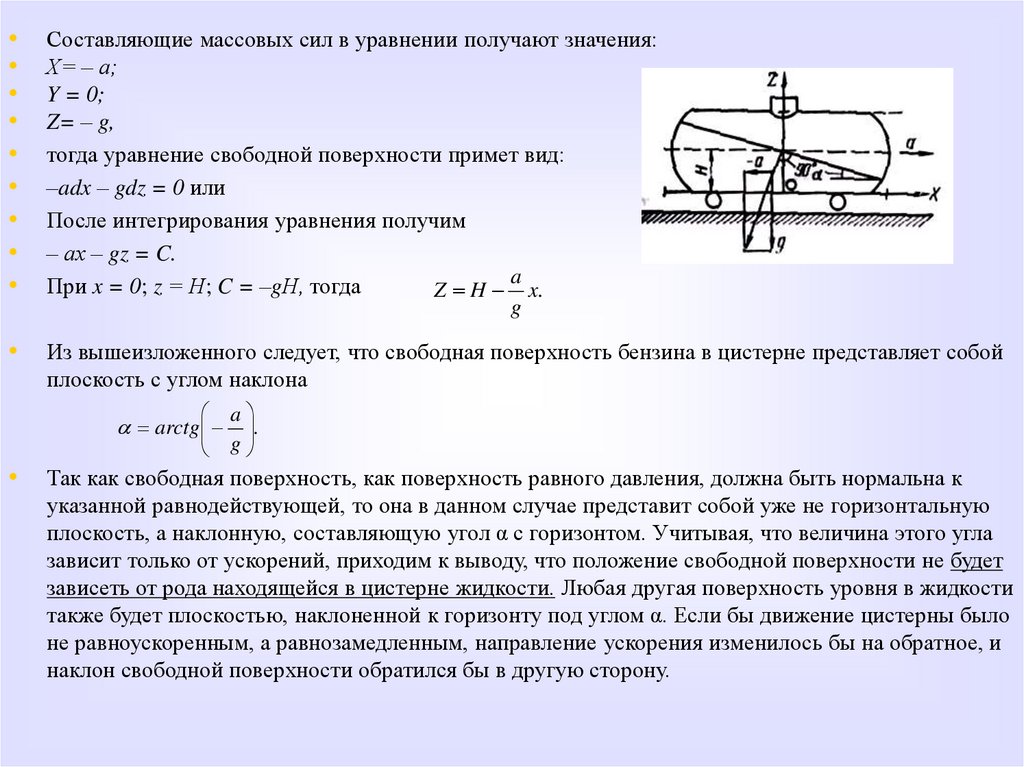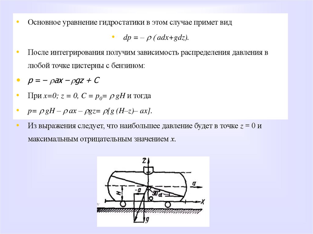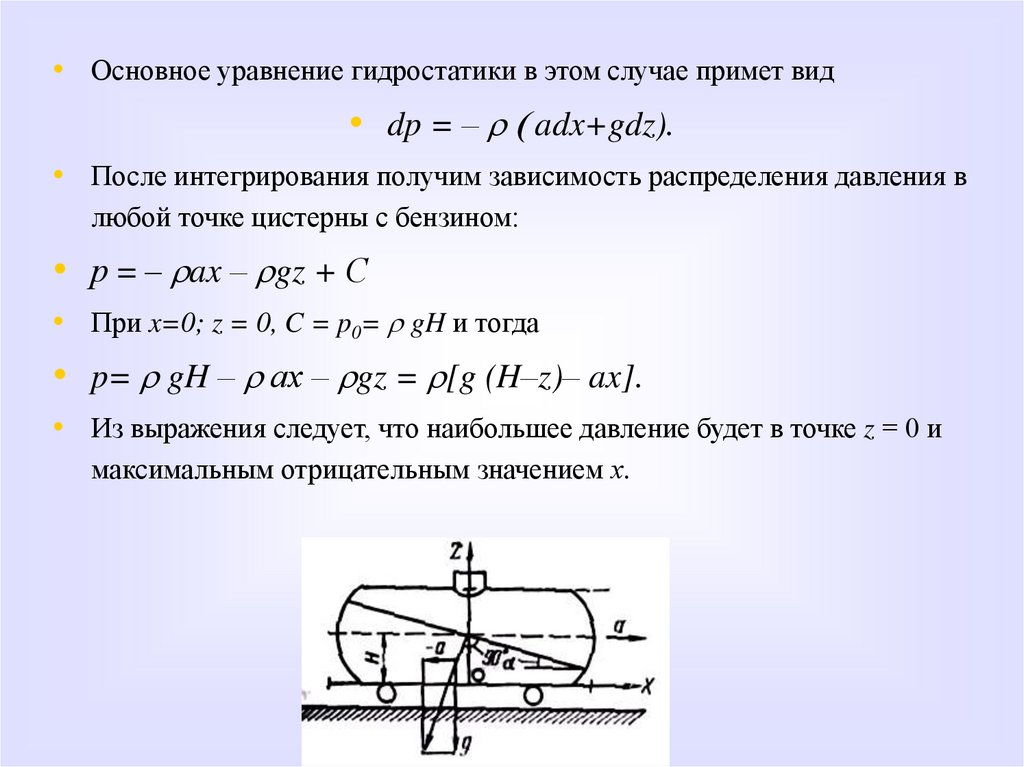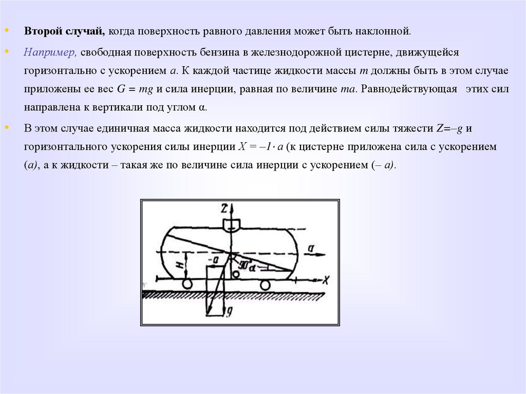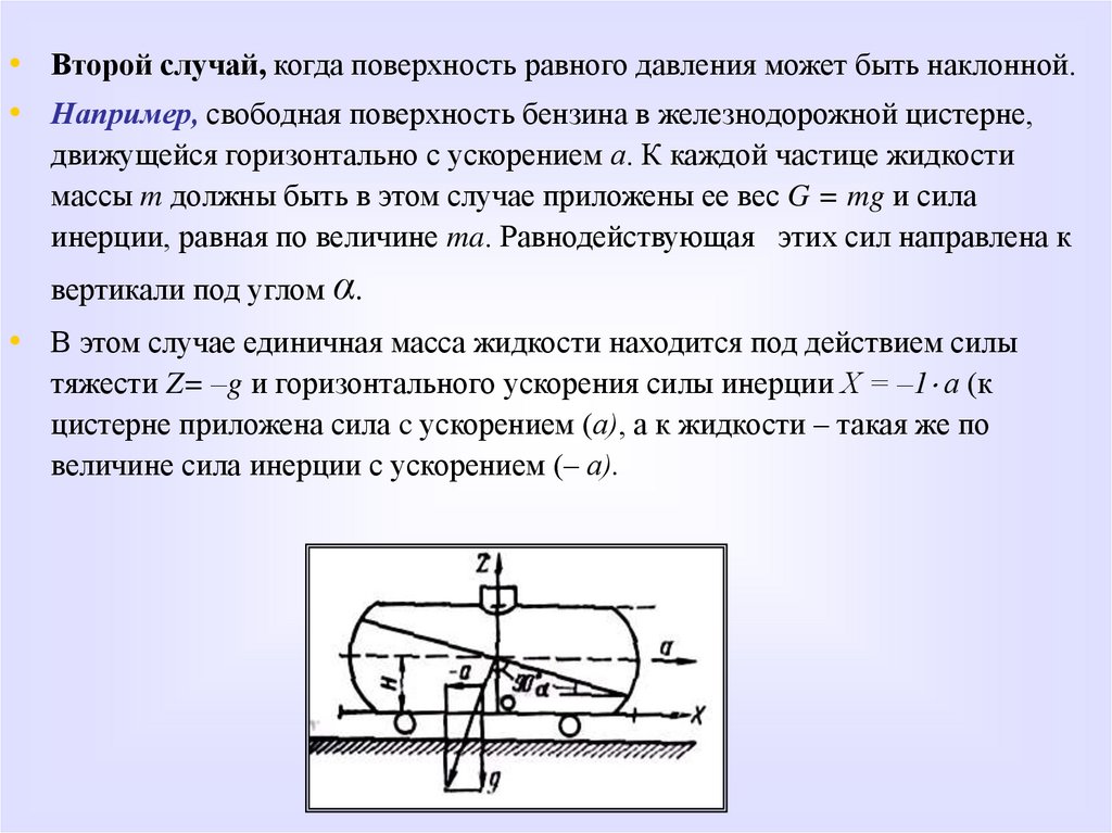 • Второй случай, когда поверхность равного давления может быть наклонной.• Например, свободная поверхность бензина в железнодорожной цистерне,