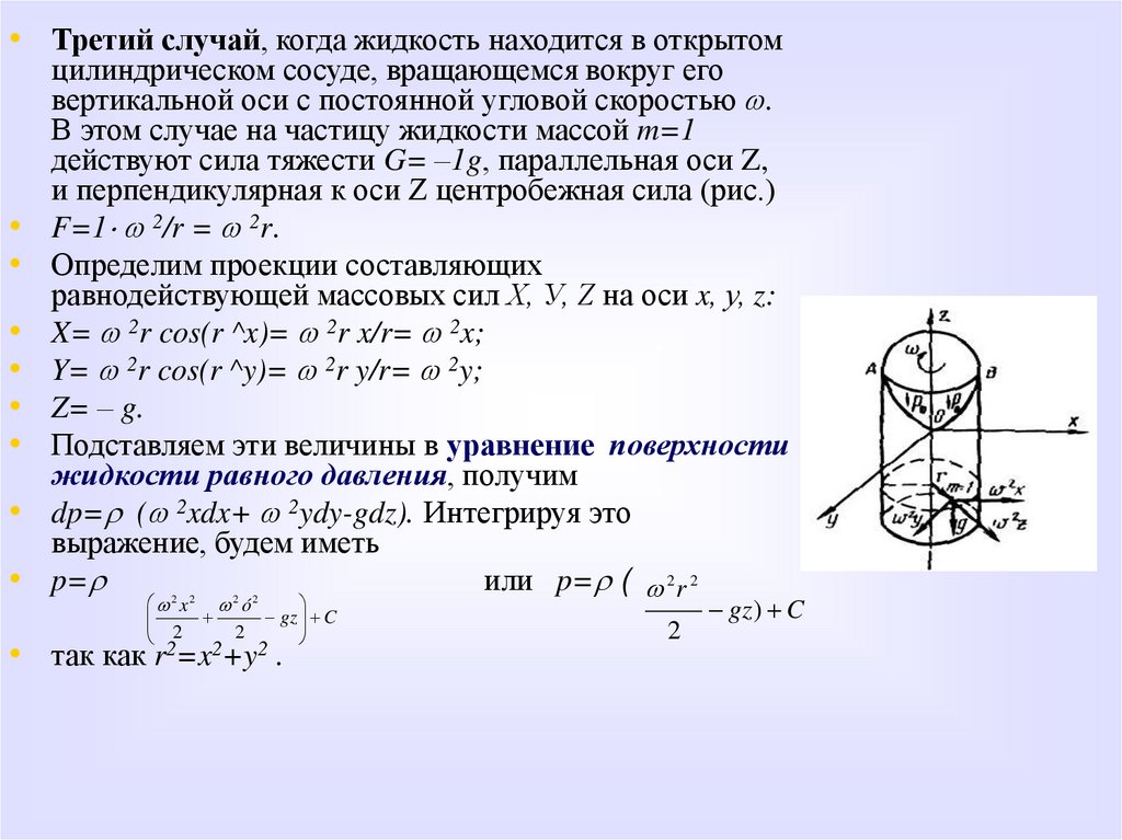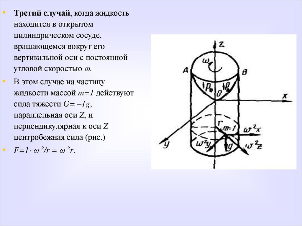 • В этом случае единичная масса жидкости находится под действием силы