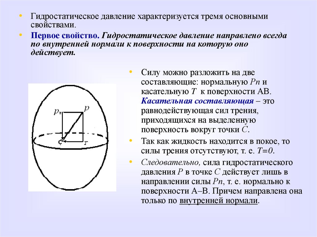 • Первое свойство. Гидростатическое давление направлено всегда