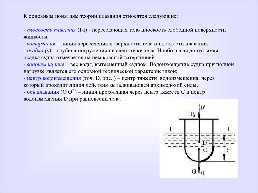 К основным понятиям теории плавания относятся следующие:- плоскость плавания (I-I) - пересекающая тело плоскость свободной поверхности