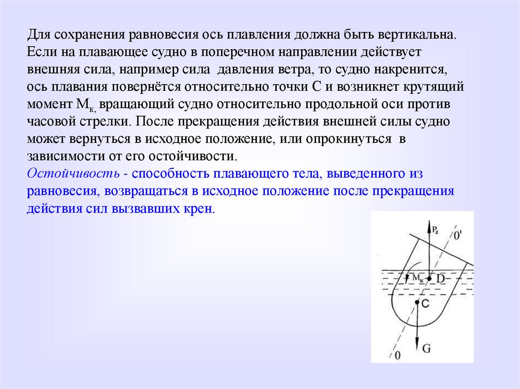 Для сохранения равновесия ось плавления должна быть вертикальна.Если на плавающее судно в поперечном направлении действует