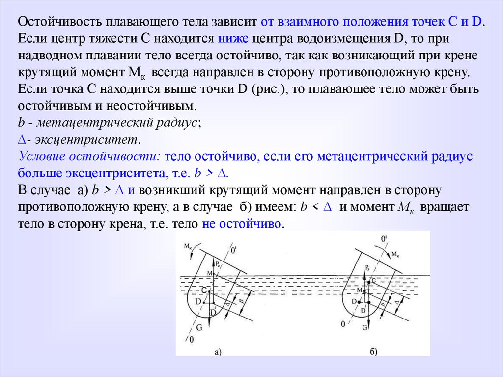Остойчивость плавающего тела зависит от взаимного положения точек С и D.Если центр тяжести С находится ниже центра водоизмещения D, то при