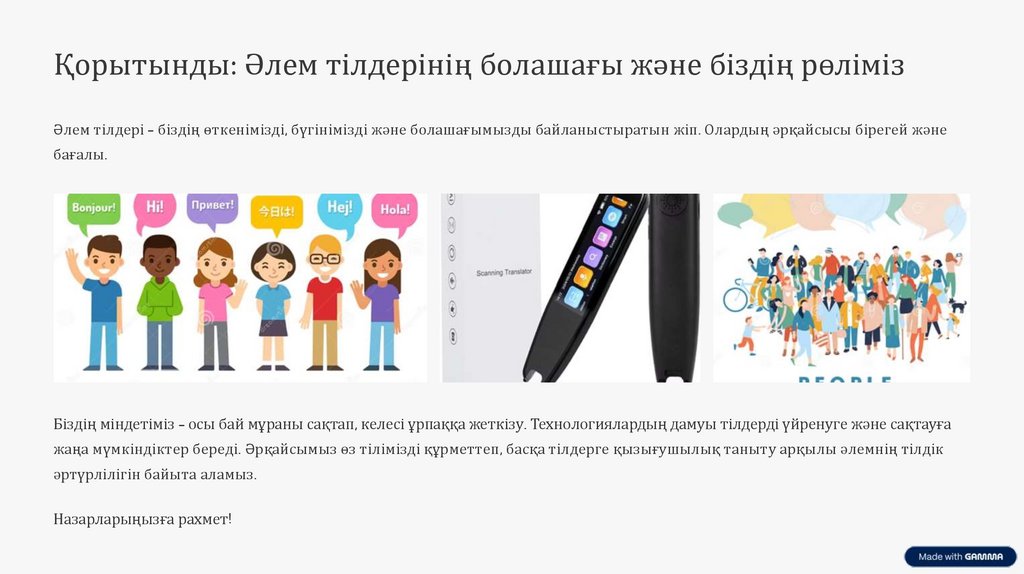 Қорытынды: Әлем тілдерінің болашағы және біздің рөлімізӘлем тілдері – біздің өткенімізді, бүгінімізді және болашағымызды байланыстыратын жіп. Олардың әрқайсысы бірегей және