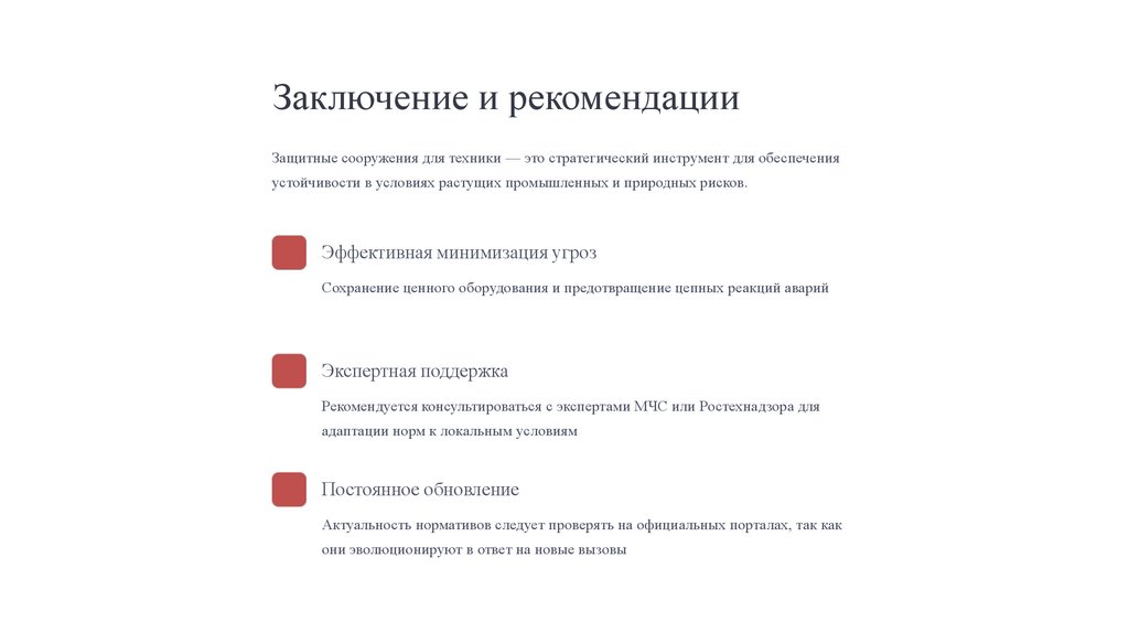 Заключение и рекомендацииЗащитные сооружения для техники — это стратегический инструмент для обеспечения