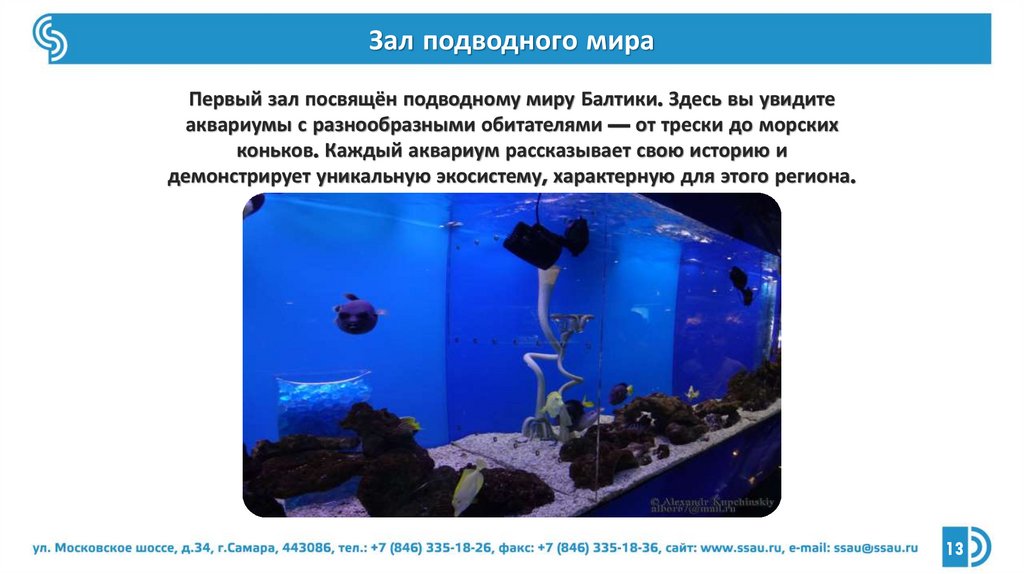 Зал подводного мираПервый зал посвящён подводному миру Балтики. Здесь вы увидите